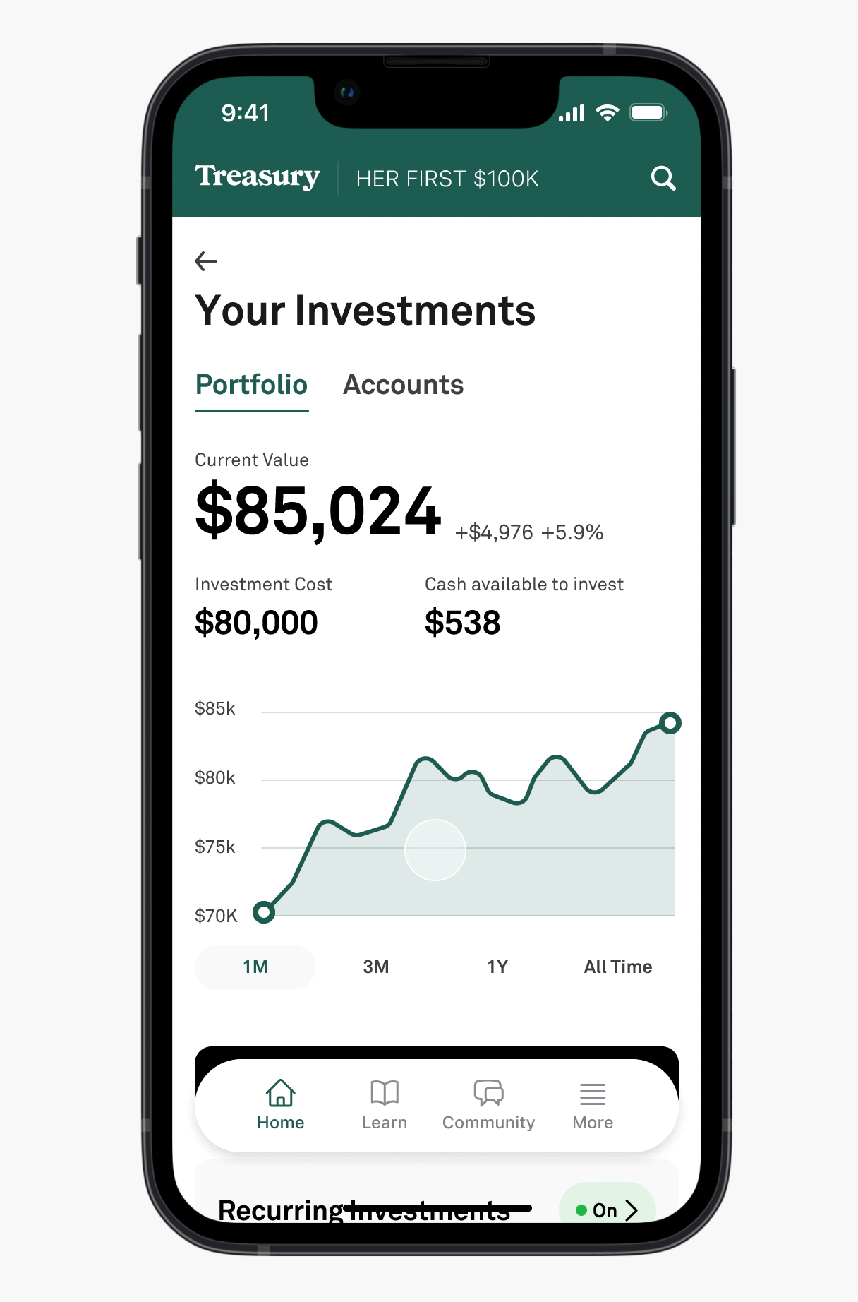 Women and non-binary people are a minority in the world of finance. Treasury's collaboration with Her-First-100k Tori offers a safe space for like-minded individuals to break down the gatekept world of investing and have a community to learn and invest together.